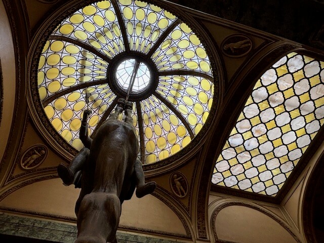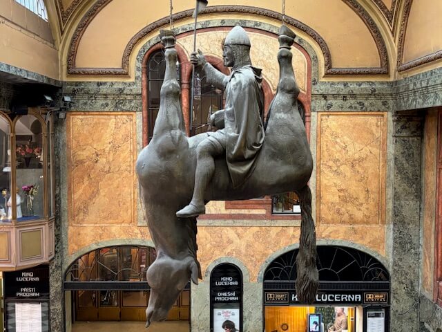 המוצג האמנותי הכי מפורסם שהפך לסמל של לוצרנה הוא פסלו של הסוס ההפוך הקשור לתקרת ההיכל. היוצר של פיסת אמנות זו הינו האמן הצ'כי דויד צ'רני, המוכר גם בתור "האמן הפרובוקטיבי", מי שעומד למשל גם מאחורי הפסל של הנערים שמטילים מימיהם על מפת צ'כיה בשכונת מאלה סטראנה, מטוסי הקרב עם כנפי הפרפר על גבי קניון מאי או פסלו המסתובב של קפקא. פסל זה מציג את ואצלב הקדוש, הפטרון והקמע של האומה הצ'כית, יושב על סוס הפוך. מדובר בפרודיה ישירה לפסל הרשמי של הקדוש הנמצא בראש הכיכר מתחת למוזיאון הלאומי, מעשה ידיו של יוסף ואצלב מיסלבק. סגנונו של צ'רני הוא דוגמה טיפוסית לחוש ההומור הצ'כי והמבט הביקורתי של האומה על סמלים היסטורים ולאומיים. בשבילך המטייל זו לא רק אטרקציה פוטוגנית, אך גם צפייה מסקרנת באמנות הצ'כית העכשווית.